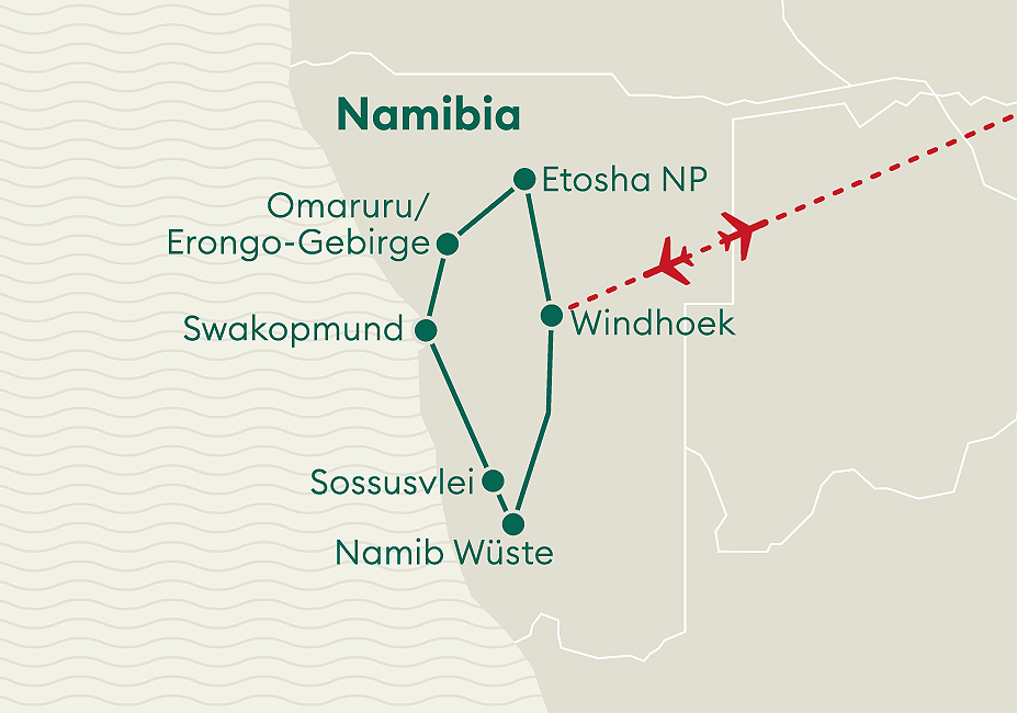 Flug ab Zürich mit SWISS nach Johannesburg (umsteigen) und mit South African Airways nach Windhoek (Reisedauer ca. 17h). Rückflug ab Windhoek via Johannesburg (umsteigen) nach Zürich.