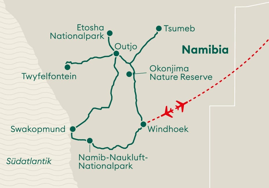 Beobachten Sie wilde Tiere im Okonjima Nature Reserve und im Etosha Nationalpark. Tauchen Sie ein in die Kultur der Himba bei einem Dorfbesuch und erkunden Sie die Küstenstadt Swakopmund. Bewundern Sie die beeindruckenden roten Dünen im Sossusvlei.