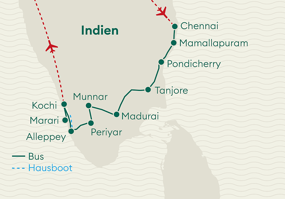 Sie fahren vorbei an der majestätischen, indo-sarazenisch erbauten Universität und der fünf Kilometer langen Marina Beach Promenade. Zum Abschluss des Tages entdecken Sie im Nationalmuseum faszinierende Skulpturen aus den Dynastien der Pallava, Pandava und Chola sowie prächtige Bronzestatuen und Exponate aus der Stein- und Eisenzeit. Tauchen Sie ein in die reiche Kunst und Archäologie Südindiens!