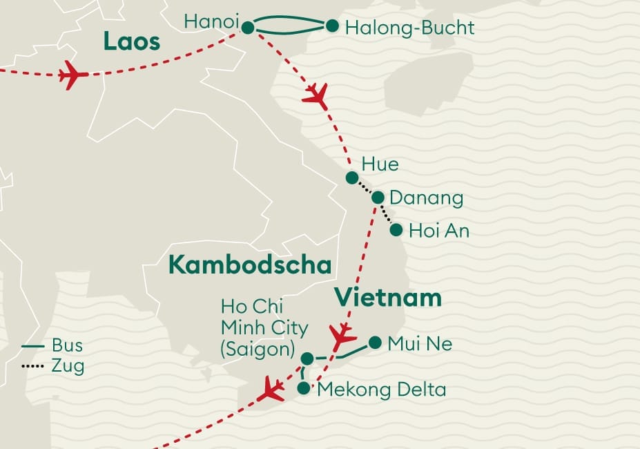 Erleben Sie das facettenreiche Vietnam: Von der lebhaften Hauptstadt Hanoi über die malerische Halong-Bucht bis nach Ho-Chi-Minh-City. Unterwegs entdecken Sie Hoi Ans charmante Altstadt, fahren mit dem Zug über den legendären Wolkenpass und erkunden das Mekong-Delta – eine Reise voller Kultur, Landschaft und Begegnungen.