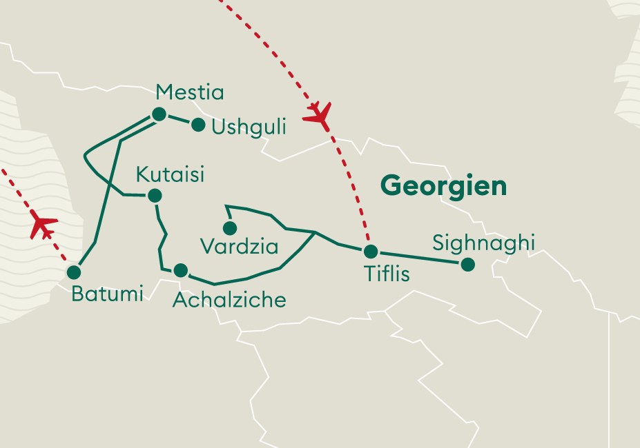 Flug mit Turkish Airlines ab Zürich via Istanbul nach Tiflis. Rückflug ab Batumi via Istanbul nach Zürich.