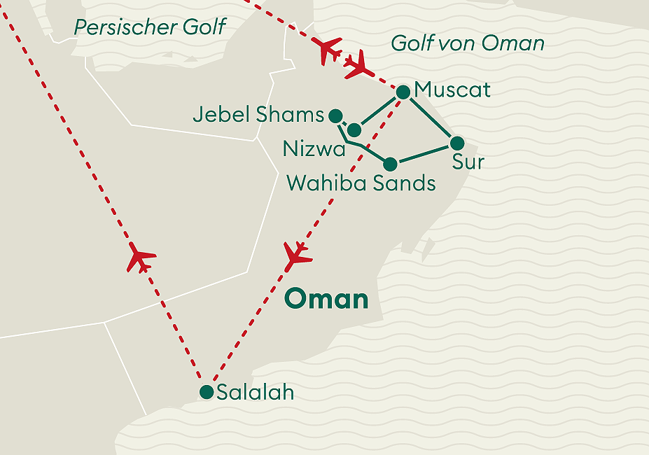 Direktflug mit Edelweiss ab Zürich nach Muscat und zurück. Bei Verlängerung: Inlandflug Muscat – Salalah. Rückflug ab Salalah nach Zürich.
