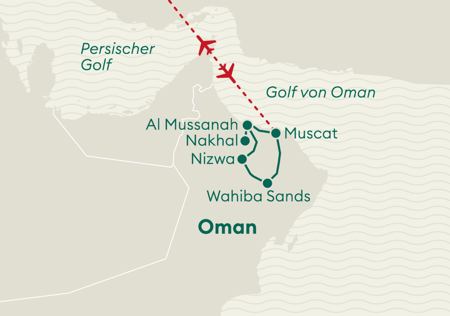 Fahrt nach Nizwa, der alten Hauptstadt des Oman. Nach Ankunft Check-in im Hotel im historischen Viertel. Am Abend unternehmen Sie einen Spaziergang durch die Altstadt und die von Mauern umgebene Festungsanlage von Nizwa. In den engen Gassen spüren Sie das lebendige Treiben des Ortes, entdecken kleine Cafés, in denen aromatischer Kaffee und Karak-Tee serviert werden, und geniessen den Blick über die Stadt von der Al-Aqur-Mauer aus.