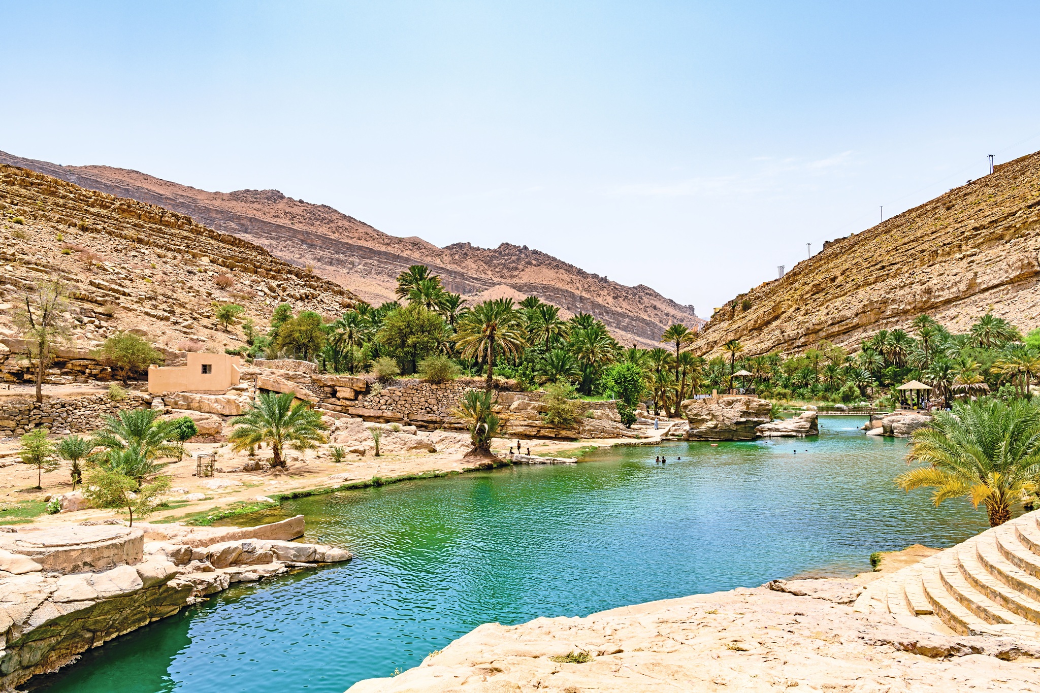 Sie verlassen in den Geländewagen die Dünen der Wahiba Sands, steigen um in einen Reisebus und fahren in Richtung Wadi Bani Khaled, dessen Name im Arabischen „natürliche Oase“ bedeutet. Dieses Wadi bildet einen faszinierenden Kontrast zur Wüste: Kristallklare, natürliche Wasserbecken und üppige Vegetation verleihen dem Tal eine beinahe tropische Atmosphäre. Während eines Spaziergangs entlang des Wadis geniessen Sie die beeindruckende Landschaft. Wer baden möchte, kann dies in voller Bedeckung tun – Badebekleidung ist nur in vollständig bedeckter Form erlaubt; Handtücher werden nicht gestellt.